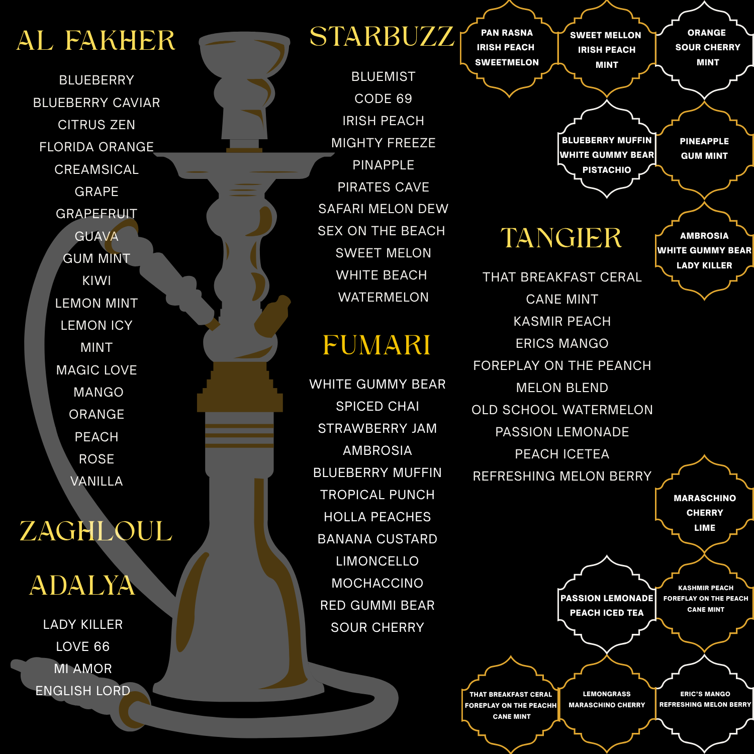 Come relax and socialize at the most relaxing place in San DIego; whether you are looking to enjoy premium hookah with coffee, soft drinks or playing board games with your friends in a comfortable environment. This is the perfect hookah lounge to complete your experience. We offer a vast selection of premium tobaccos to choose from in addition to our great selection of drinks and sweets!